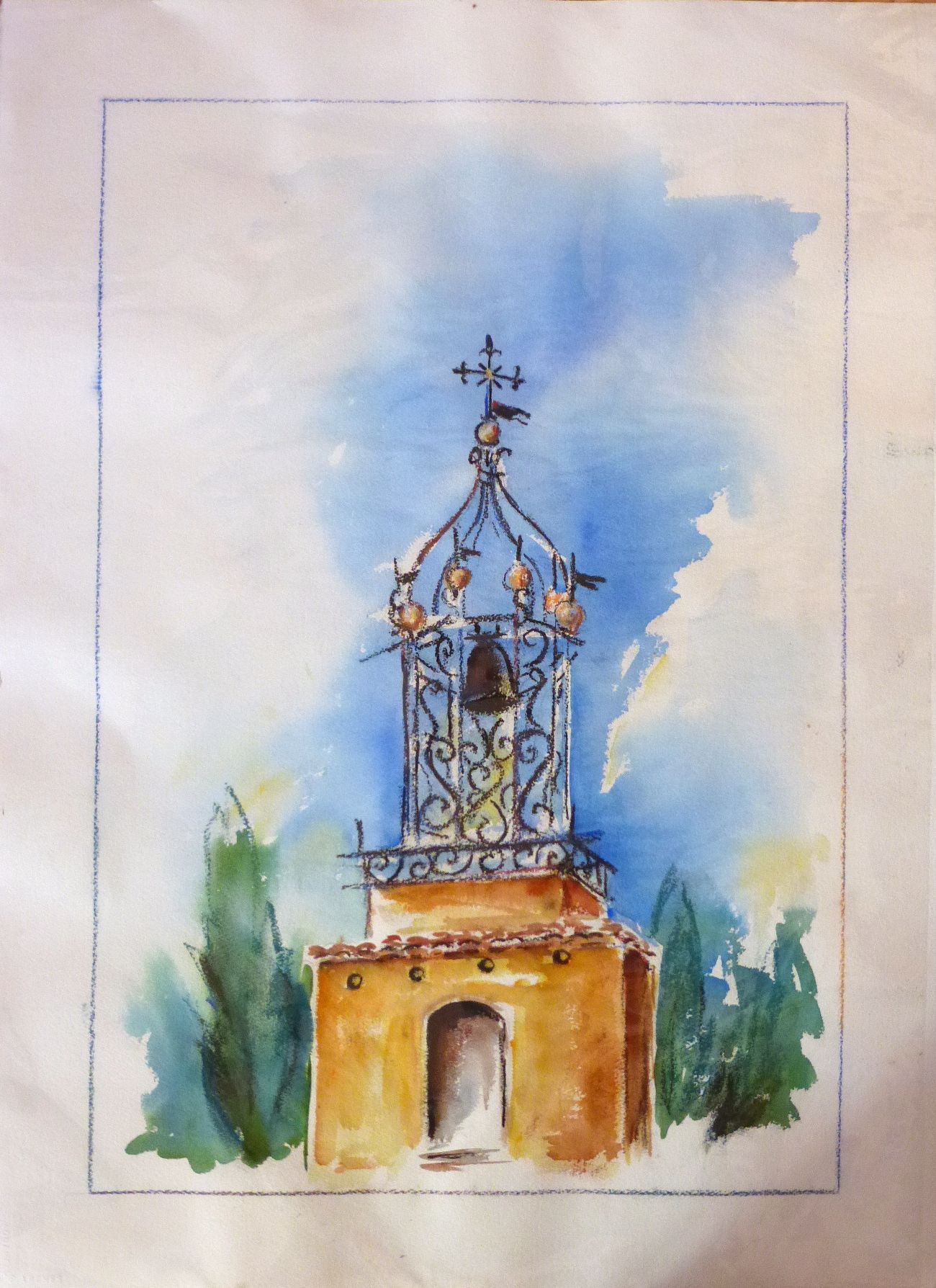Campanile en provence, pastel et aquarelle
