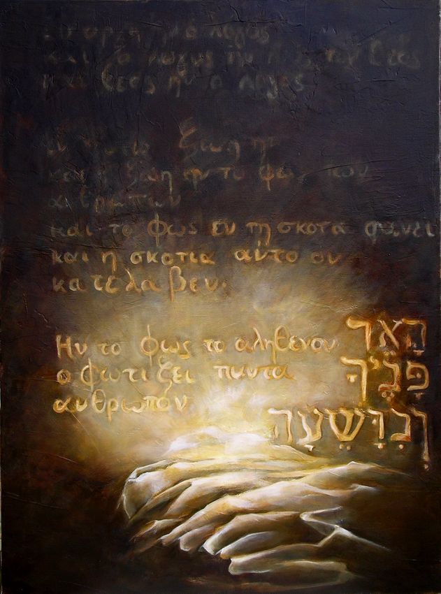 En grec les versets 1, 4, 5 et 9 du Prologue de saint Jean, le verset 9 étant le plus en lumière :